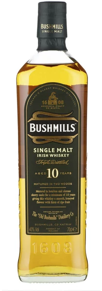 A Bushmills 10 éves single malt whiskey gazdag, gyümölcsös és vaníliás jegyekkel hódít. 0,7 literes palackban.