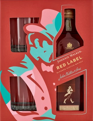A Johnnie Walker Red Label klasszikus blended whisky, pohárral csomagolva.