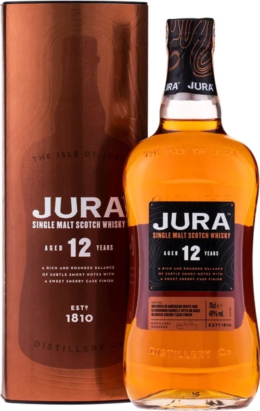 A Jura 12 éves single malt whisky gazdag, mély ízvilágot kínál, enyhén füstös és gyümölcsös jegyekkel. 0,7 literes palackban, díszdobozban.