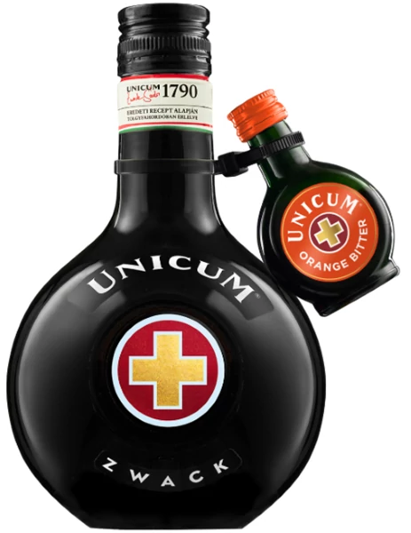 A Zwack Unicum 0,5 literes palackban, 40%-os alkoholtartalommal, Unicum Orange mintával kiegészítve.